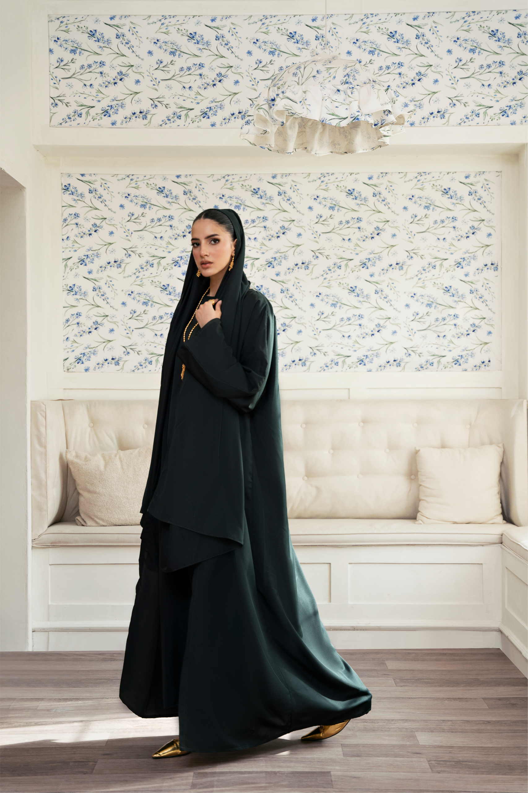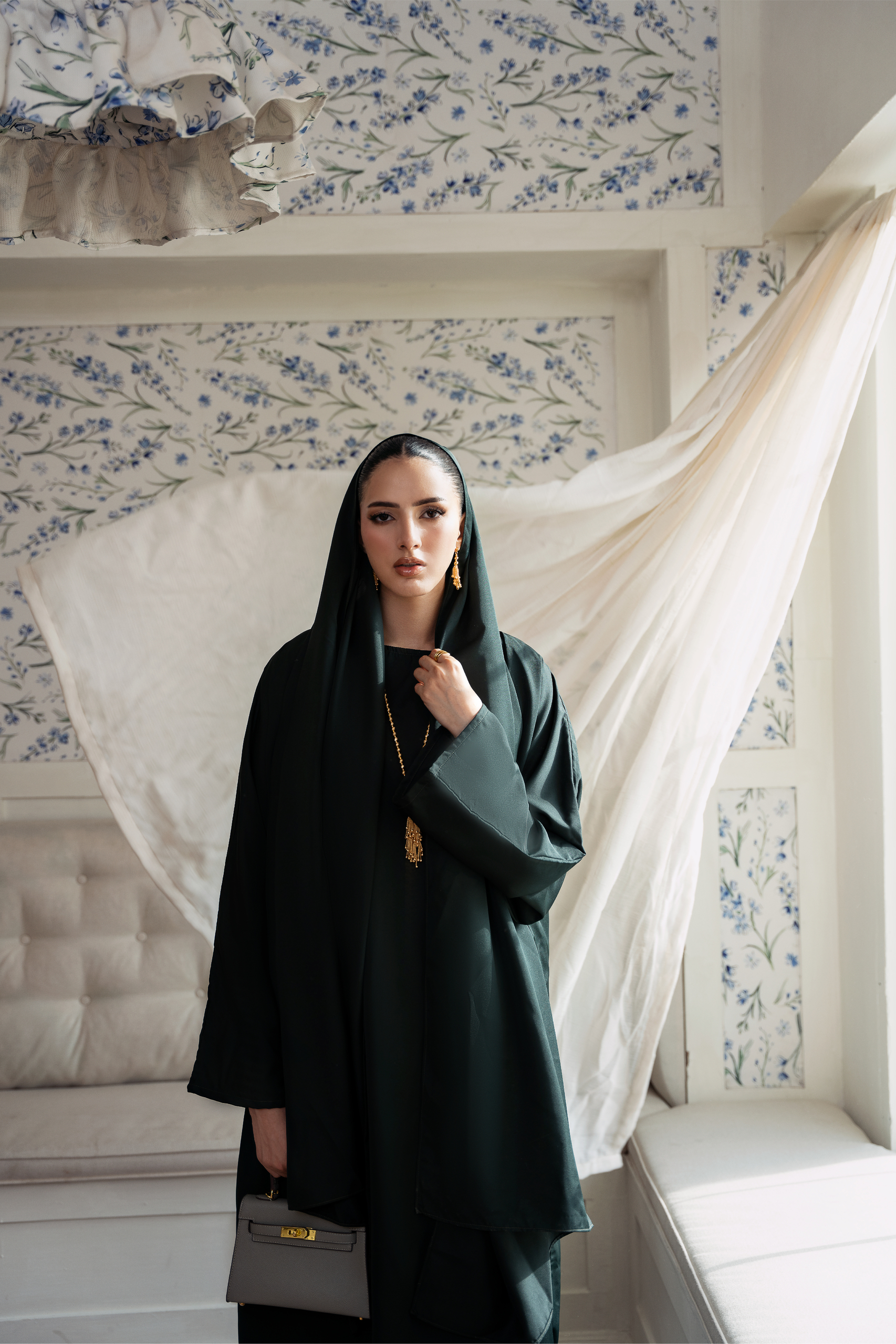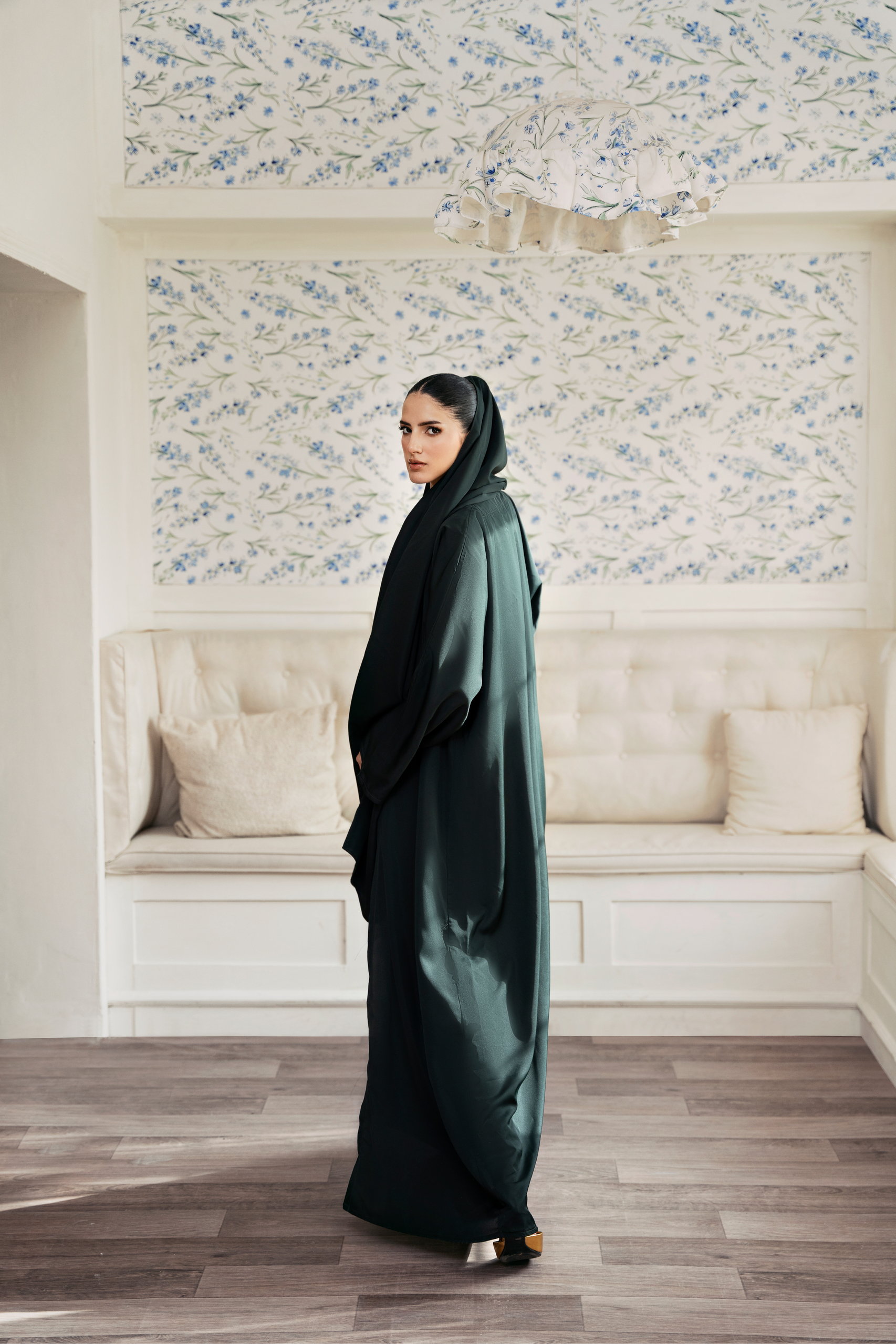 this open abaya is crafted from high-quality Nada fabric in a rich green hue. Lightweight, breathable, and effortlessly graceful, it’s designed for layering and movement.